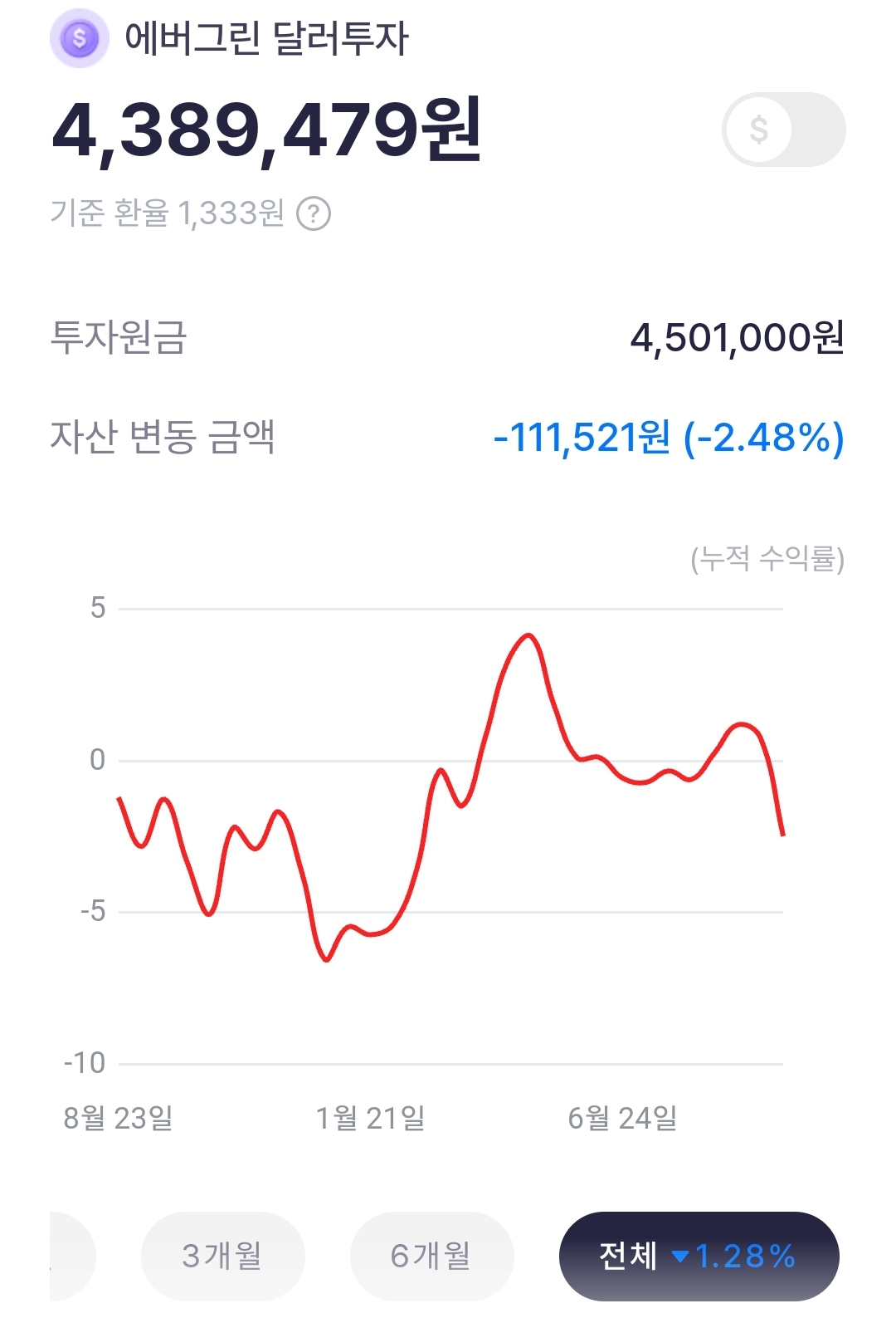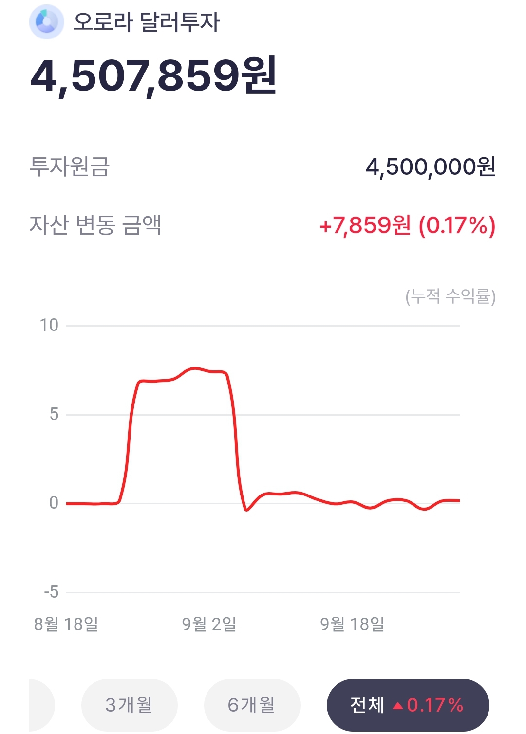 참고할 것은 오로라 달러투자의 경우 서비스를 시작한지 몇달 안됐기 때문에 에버그린 달러투자의 경우 15개월 30만원씩 450만원 투자가 이뤄진 상황이고 오로라 달러투자는 서비스 시작 기점으로 에버그린 달러투자와 금액을 맞춰 총액을 똑같게 했고 이후 매달 30만원씩 투자를 하고 있다.